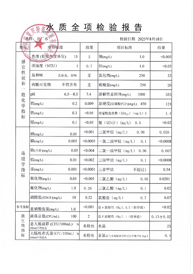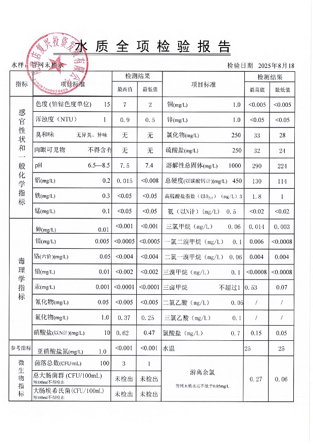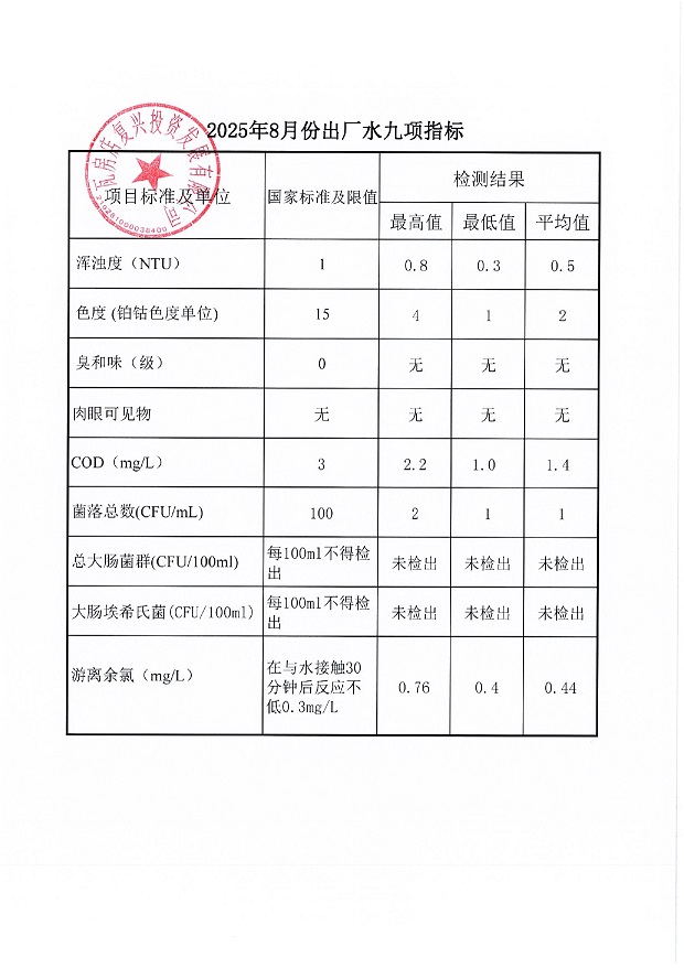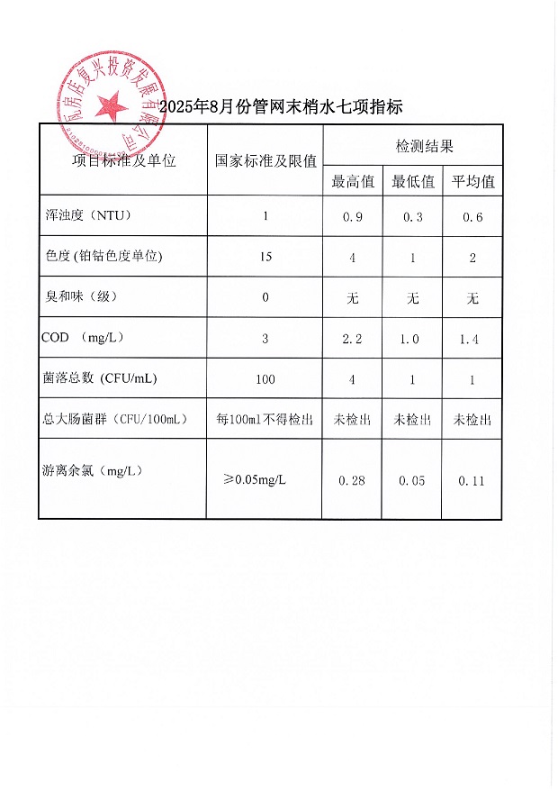 瓦房店自来水公司2025年8月份水质信息