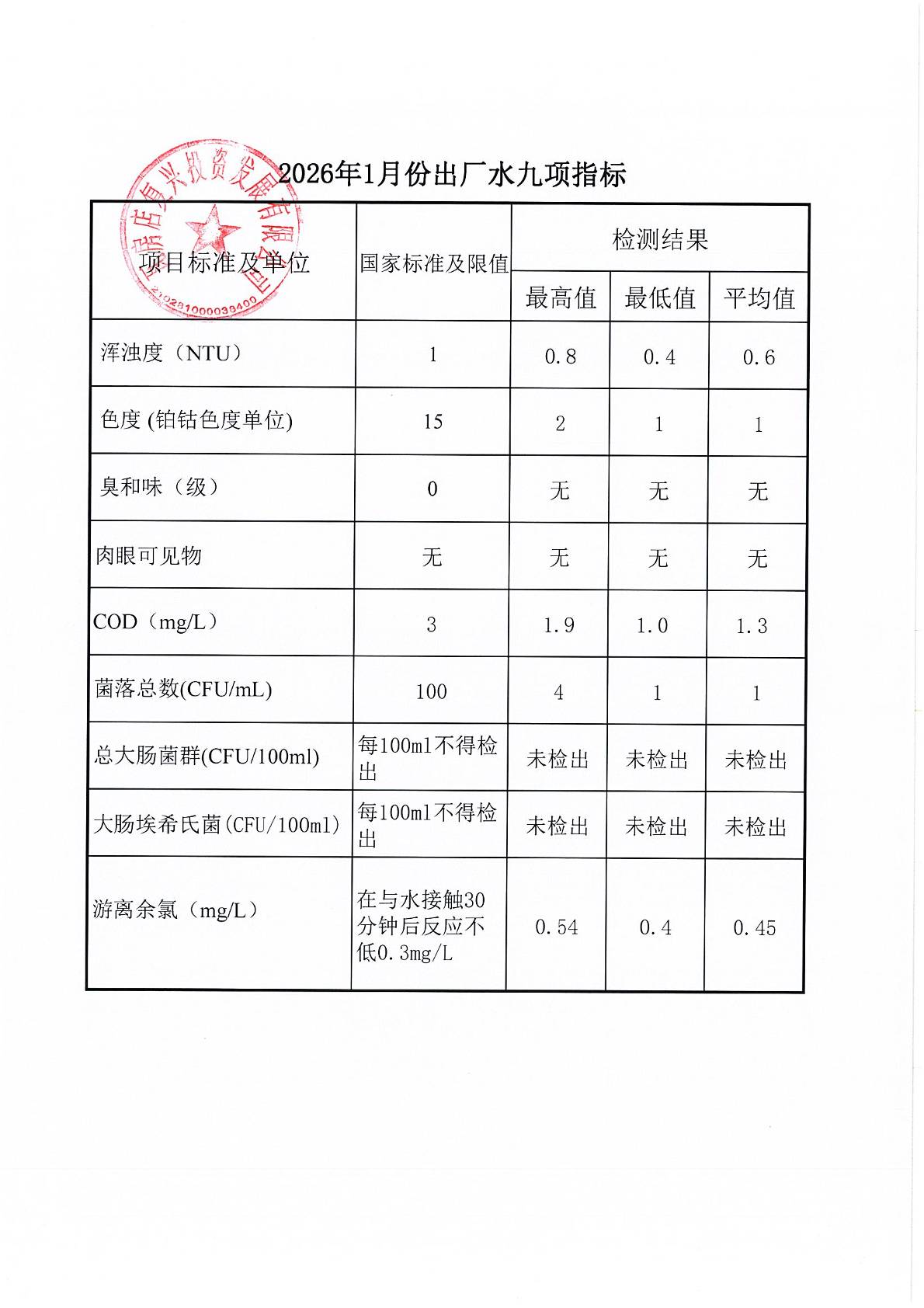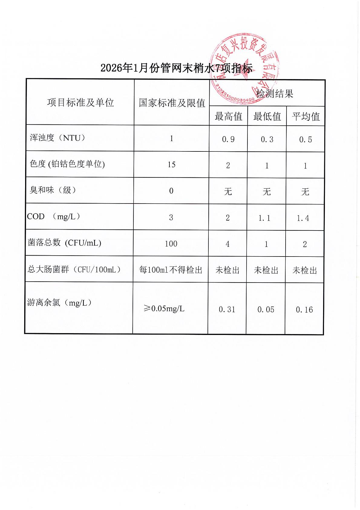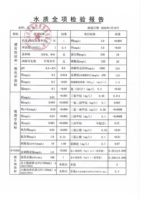 瓦房店自来水公司2026年1月份水质信息